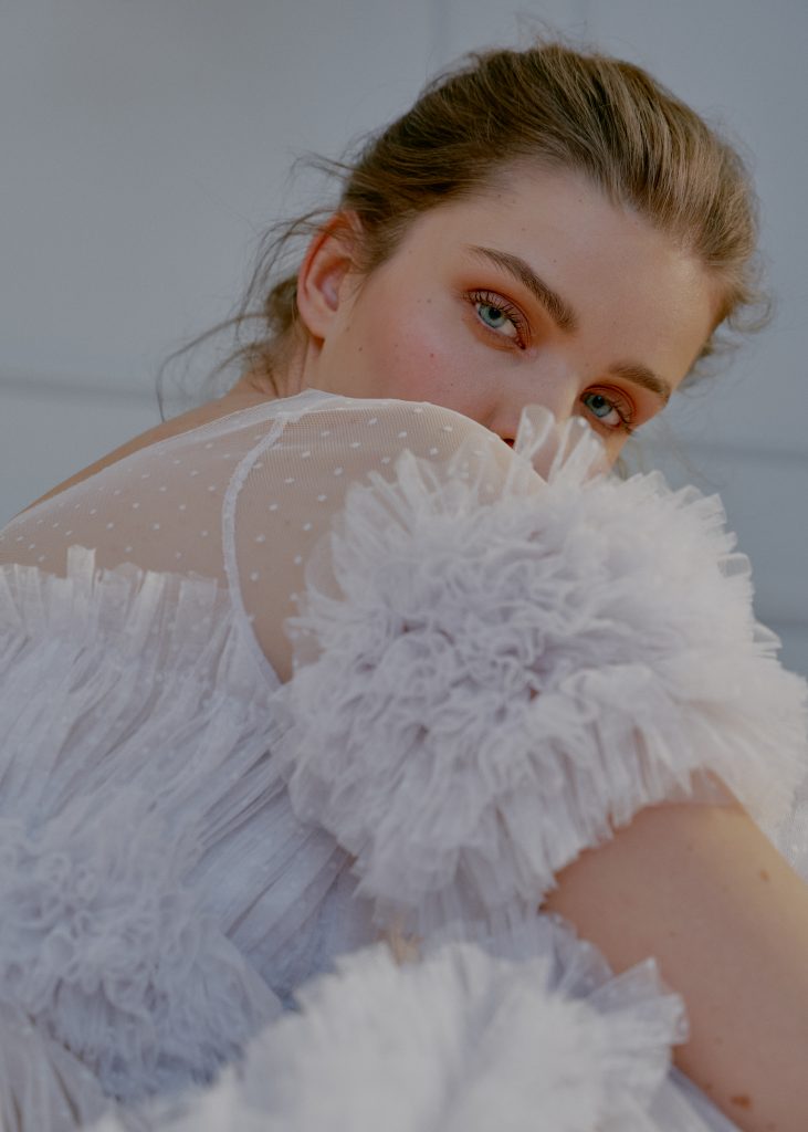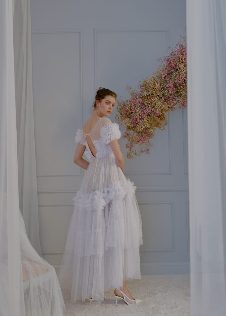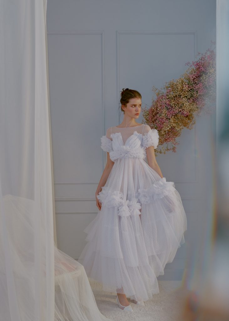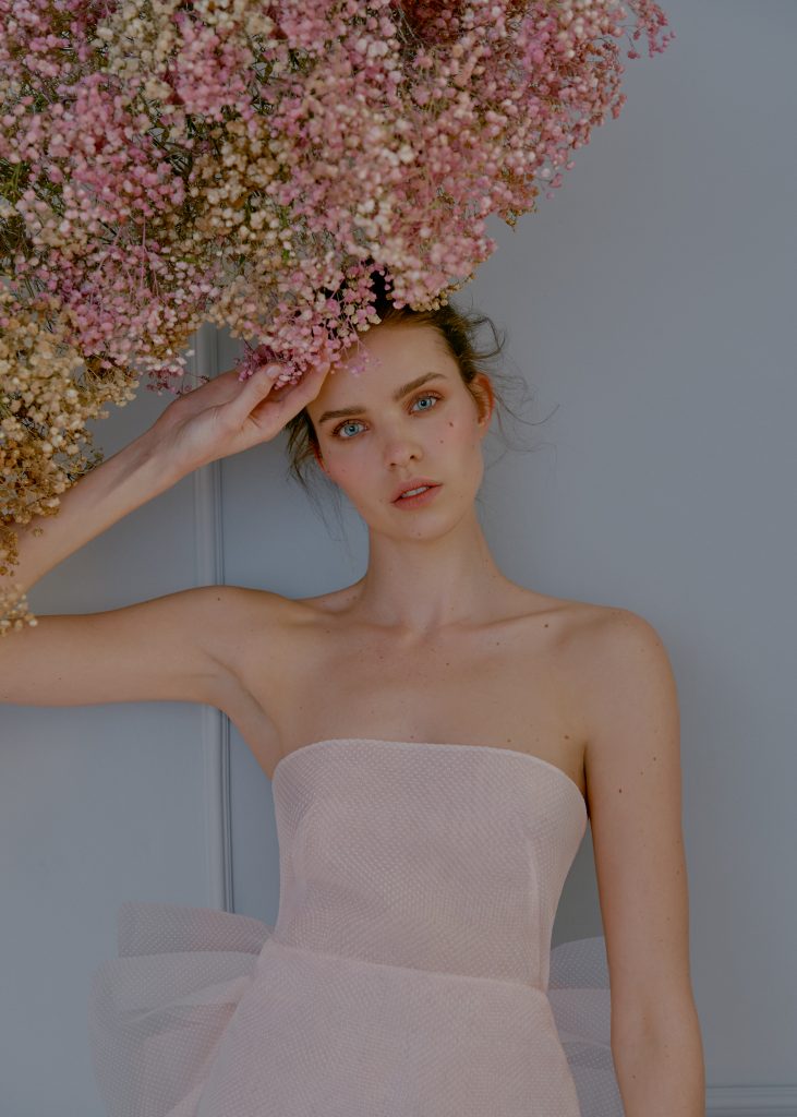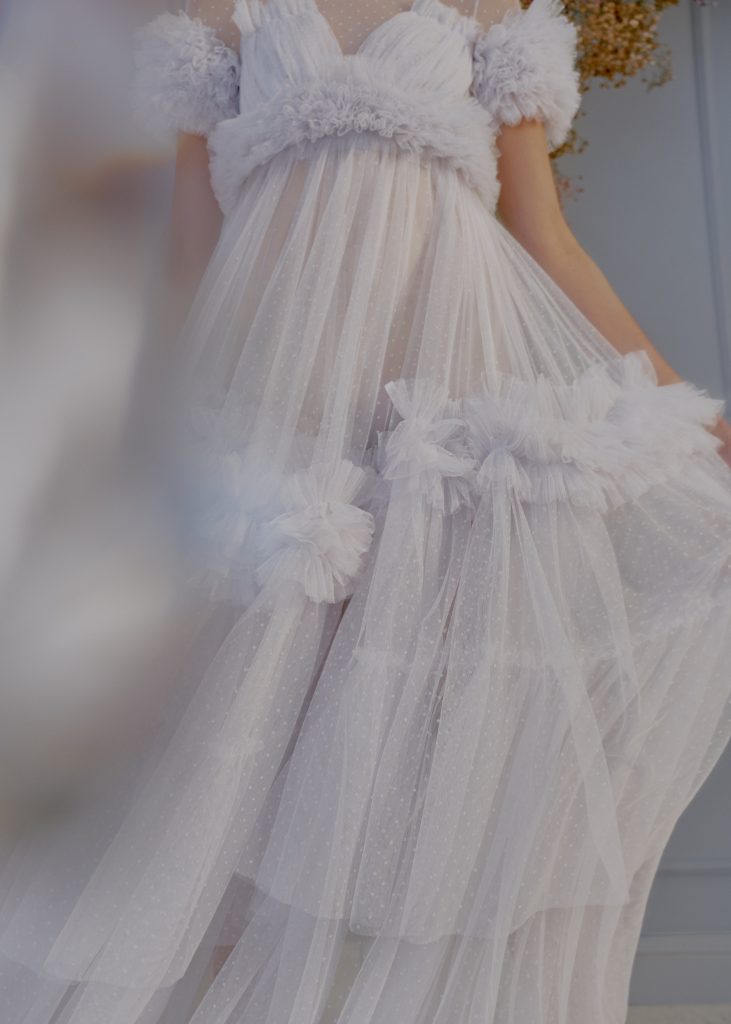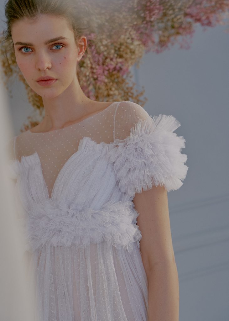 Los colores evocan a las nubes, que dispersan la luz e irradian un hermoso blanco. Otras veces, cuando el sol se pone en el horizonte, se convierten en maravillosos tonos rosados. Los tejidos siguen esta metáfora y son ligeros; tanto que parecen suspendidos en el aire y modelan la silueta con drapeados, pliegues y aperturas que aportan delicadeza y elegancia. Se acompañan con destellos en forma de aplicaciones y bordados de perlas, lentejuelas, flores y varios tipos de cuentas translúcidas.