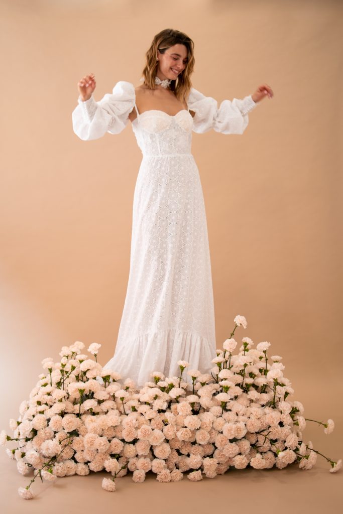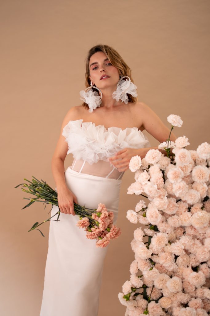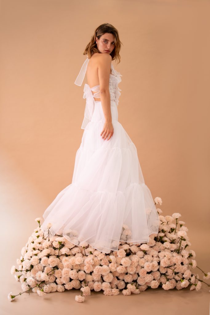 Cada vestido es un jardín en sí mismo, con flores aplicadas para generar un cuerpo delantero, claveles de organza en los puños, tejidos de algodón con flores bordadas a modo de estampado y las ilustraciones sobre organza en mangas, caídas tipo velo o sobre el vestido al completo.