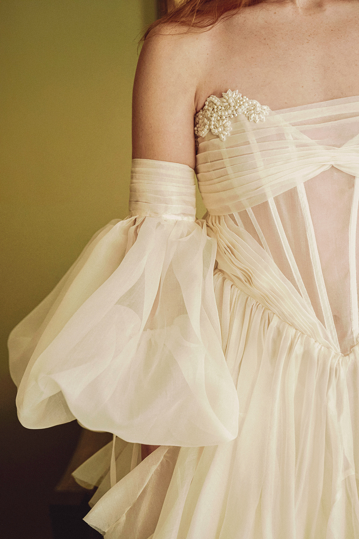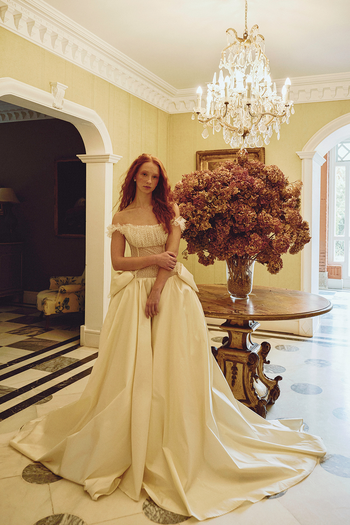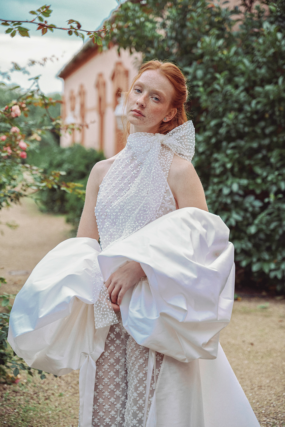La delicadeza del tul y la organza de seda, que aportan un movimiento ligero y lleno de vida. La estructura elegante del tafetán, que recupera la esencia de la costura de siempre. Sutiles detalles de pedrería, que iluminan el diseño como los recuerdos más especiales.